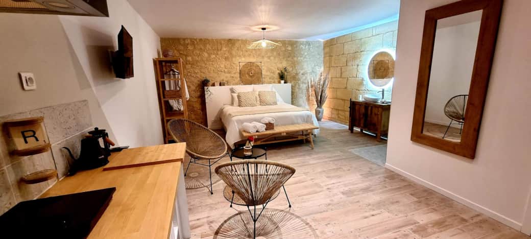 Située au cœur des vignobles de Montagne Saint-Émilion, Ô Petit Sarment est une suite privative de 35 m², entièrement indépendante, idéale pour un séjour romantique à deux en Gironde. Profitez d’un espace pensé pour votre bien-être avec une literie king-size haut de gamme, une salle de bain élégante et une kitchenette équipée pour un séjour en toute autonomie. Parfait pour un week-end détente ou une escapade en amoureux près de Saint-Émilion.